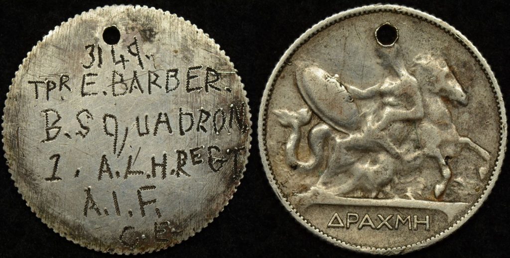 Unofficial World War 1 AIF ID tag made from Greek silver drachm. Obverse of coin has been skimmed and the coin has been holed. The skimmed obverse has been crudely engraved with “wiggle-work” and reads: