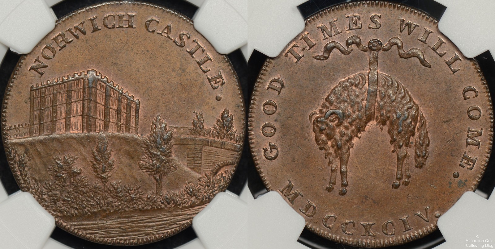 1794 D&H-13 Norfolk – Norwich Castle Conder Halfpenny D&H Norfolk 13, 1/2p, Norwich, edge lettering “Richard Bacon Cockey” Coin Information Reference Number: C031602 Country: Great Britain Denomination: 1/2d Year: 1794 Grade: NGC MS63BN NGC Reference: 2802952-015